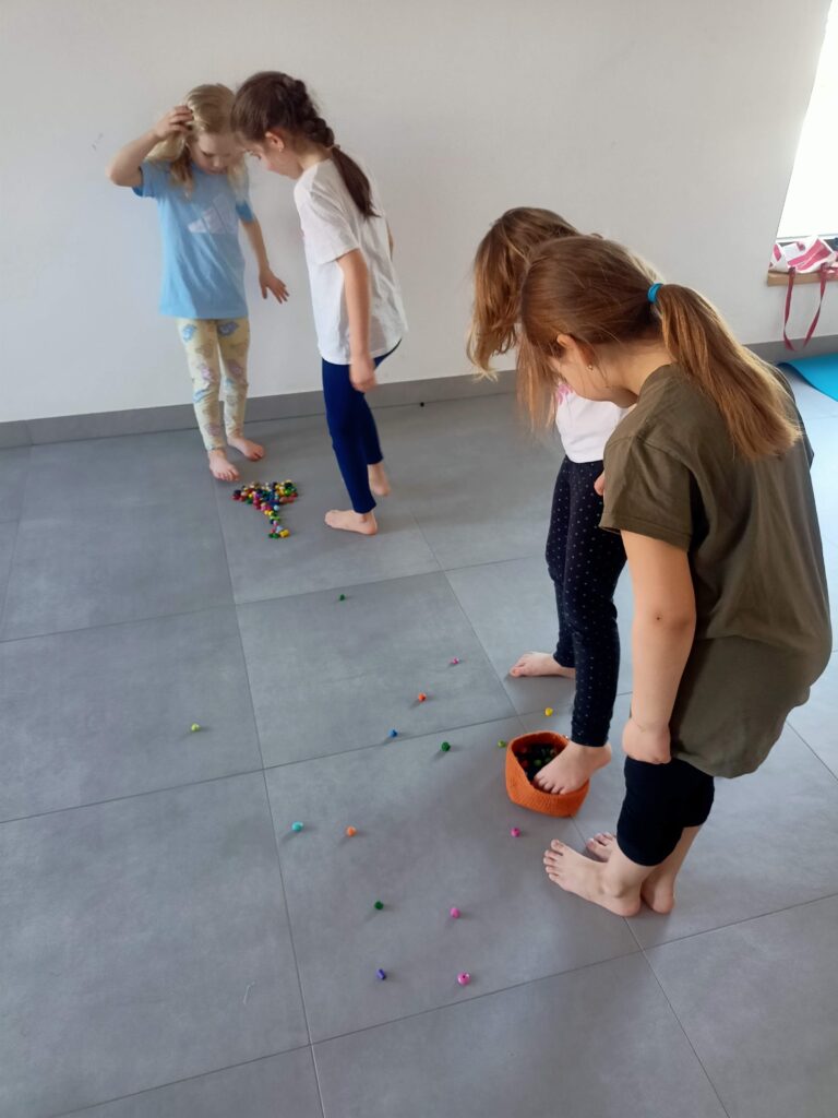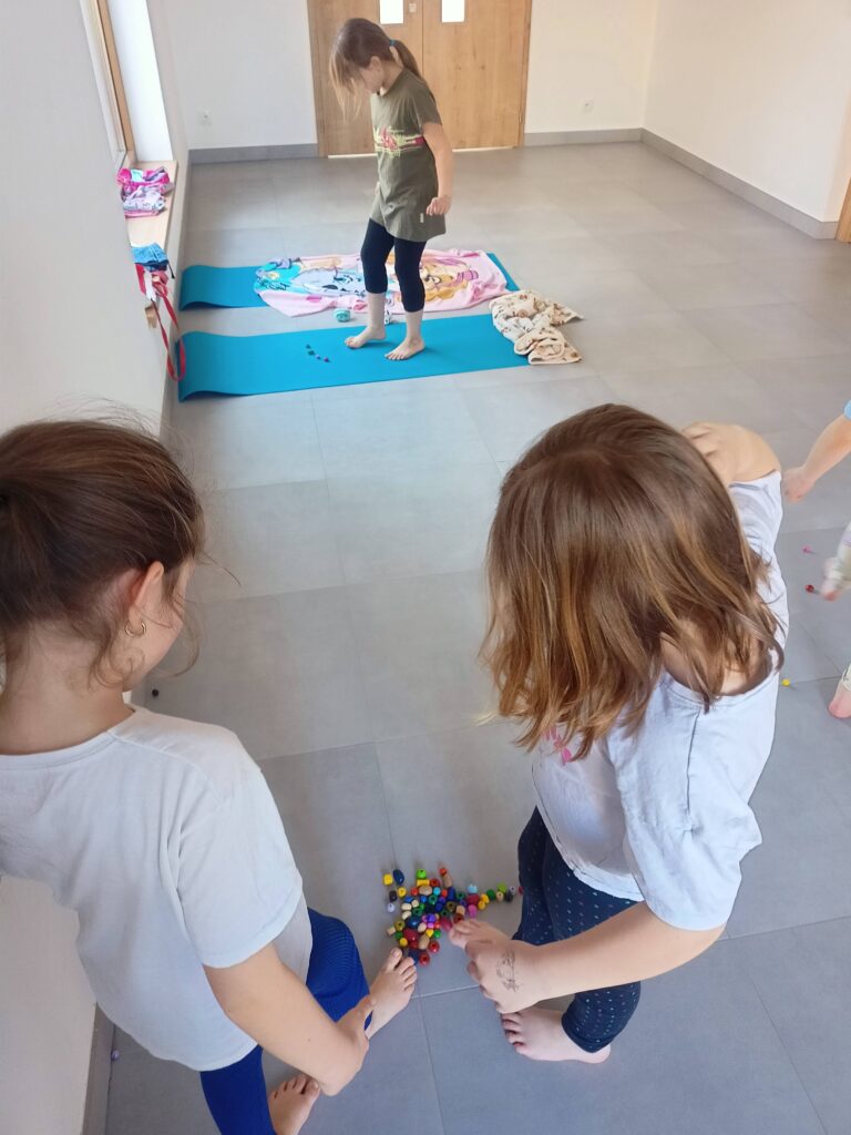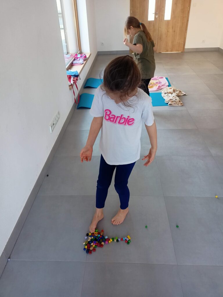 Velkou pozornost věnujeme také aktivaci plosky nohy pomocí her. Děti chodí naboso, zkouší uchopovat drobné předměty prsty u nohou nebo plní zábavné úkoly, které podporují správné držení těla a zdravý vývoj chodidel.